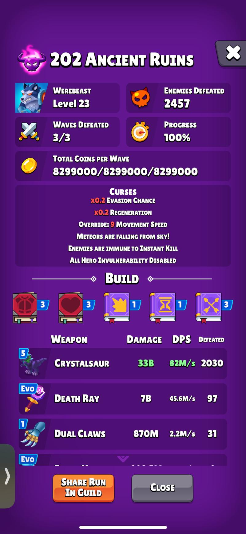 Follow that up with an Ice Wand max and Life Tome. If you have 4* arcane staff, that's your next priority and the cornerstone of the Werewizard Build. The slow from Death Ray is how you will clear out Part Two of Nightmare Mode.Next, I personally really like Boomerang. The 2* forge stun goes off reliably for me, so I like it more than crossbow or bomb. Round out your base weapon build with one of those two or divine aura.