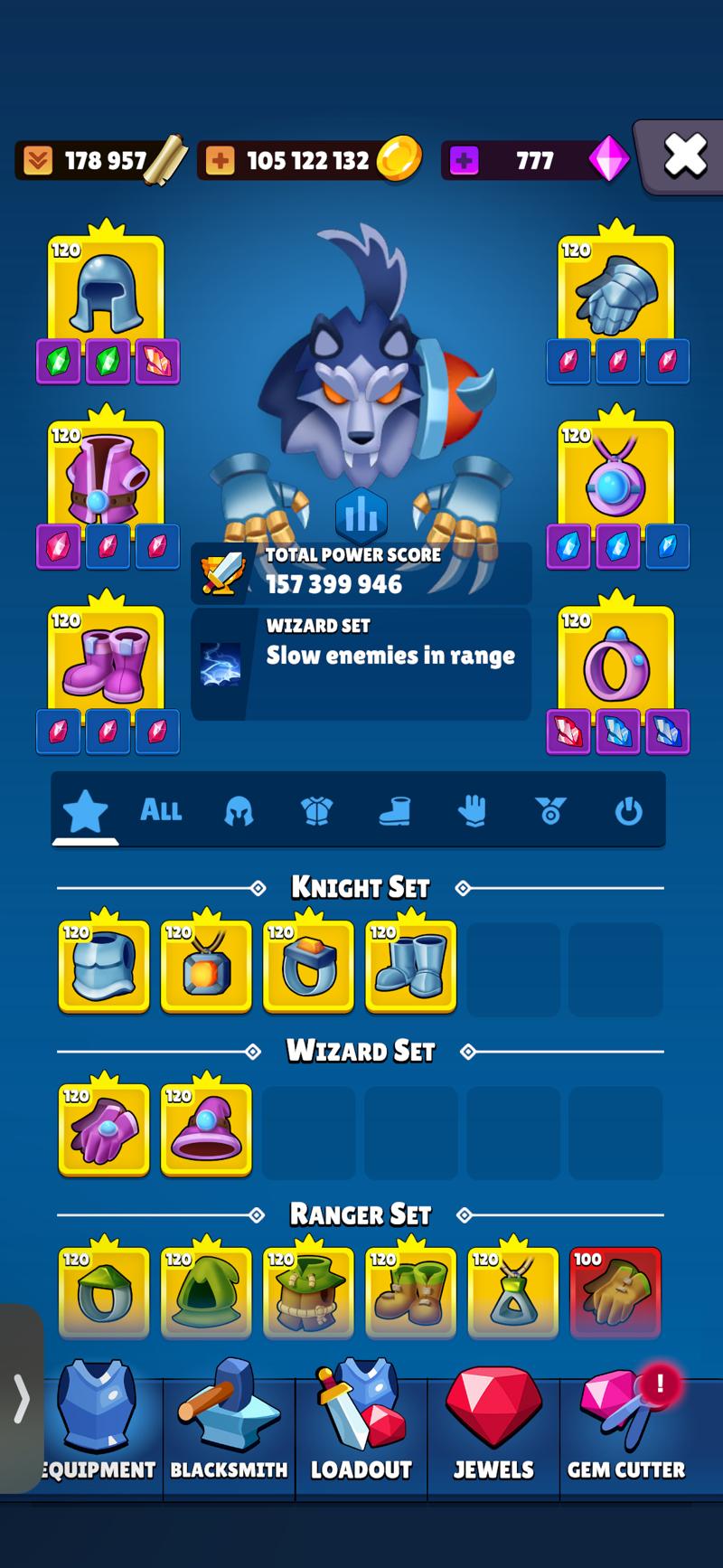 Wizard helm with wizard robe, knight boots, knight gloves, wizard amulet, and wizard ring.